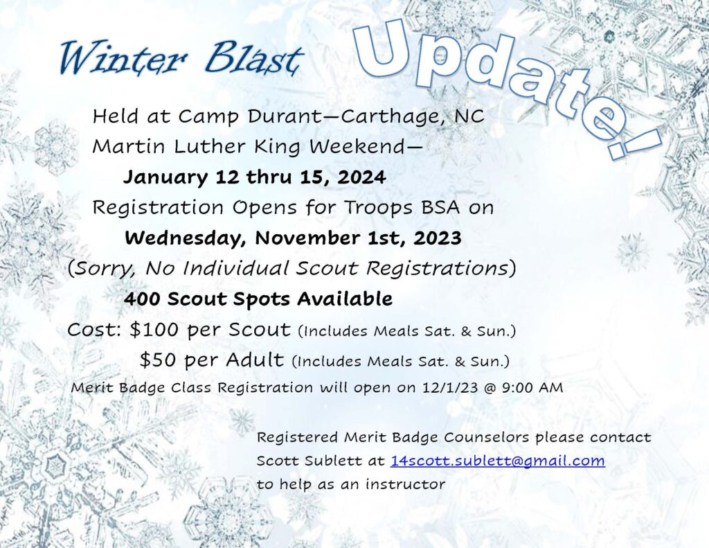 We found an alternative winter camp with registration starting next Wednesday, November 1. We spoke with the Occoneechee council and they mentioned registration will fill immediately, similar to Pipsico. This year’s Leaders Guide isn’t available yet, but they said it will be updated soon. Here’s a link to last year’s program: SF-leaders-guide-April-2023-As-of-2-7-23.pdf (ocscouts.org)